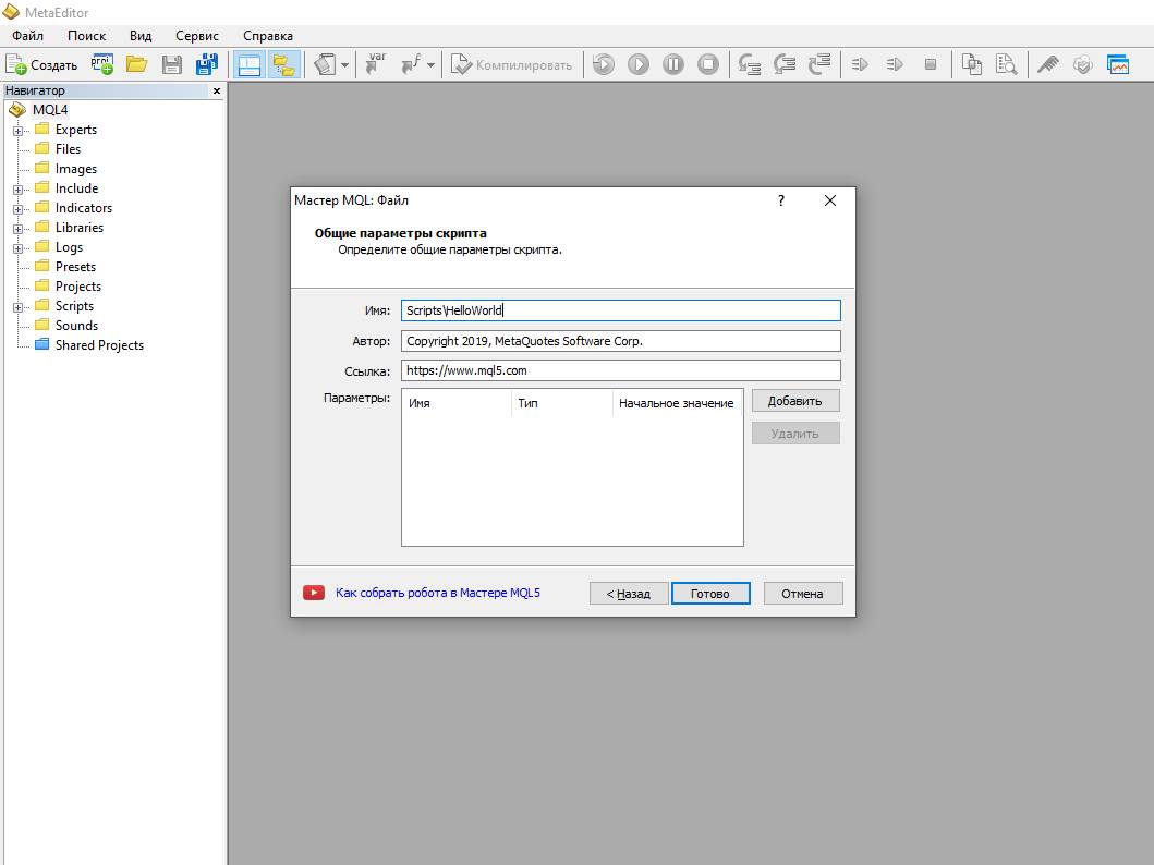 После того, как все необходимые данные будут введены, нужно нажать на кнопку «Готово», после чего откроется заготовка нашего скрипта.