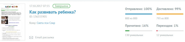 То же и с имейлом. Имейл открывают все меньше и меньше. Приведу реальную картинку 17.10.2017. Нашим детским центром сделана рассылка, отправлена 800 клиентам, прочитали только 130 человек. Всего лишь 16% открыли это сообщение, хотя эти клиенты – это не купленная база, это клиенты, которые у нас либо занимаются, либо не так давно занимались.