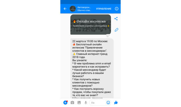 А хочу я начать с того, почему все озаботились этими мессенджерами, почему сейчас в новостях постоянно мы слышим: «„Фейсбук-мессенджер“, чат во „ВКонтакте“, всякие возможности в „Одноклассниках“, в WhatsApp». Сейчас все крупные соцсети, в том числе и «Фейсбук», прилагают какие-то усилия для того, чтобы усложнить жизнь обычному малому бизнесу.