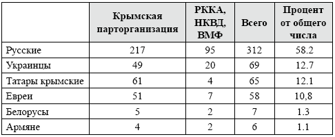 Собственно крымская партийная организация была представлена 401 депутатом. Русские – 55 %; крымские татары – 15.2 %; евреи -12.7 %; украинцы – 12.2 %. На оставшиеся одиннадцать народов, среди которых были характерные для Крыма единичные вкрапления: армян, болгар, караимов, крымчаков, немцев приходилось всего 3 % и оставшиеся 1.9 % – оказавшиеся в Крыму пять белорусов, а также по одному: казанский татарин, литовец, чуваш.