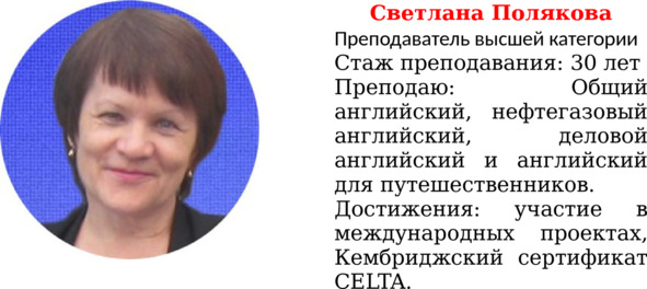 Меня зовут Светлана Полякова. Я сооснователь онлайн-центра английского языка «Lingaim». Вот уже около 30 лет я преподаю мой любимый язык – английский. И получаю огромное удовольствие, вдохновляя других людей на изучение этого языка. Видеть, как человек загорается интересом и затем ощущать его прогресс в языке – совершенно невероятное чувство!