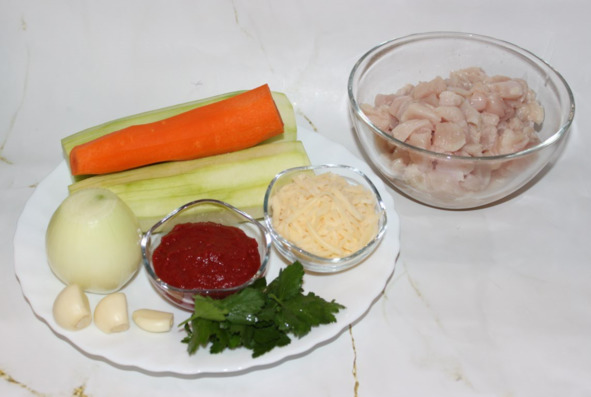 • Мелко нарезать куриное филе, лук и чеснок. Натереть морковь на мелкой терке