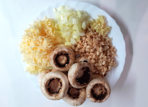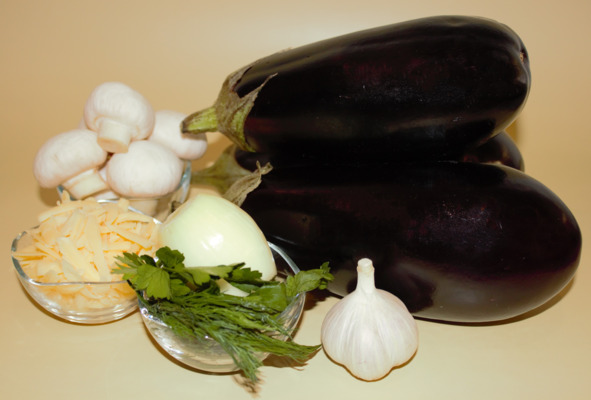 • Мякоть баклажана, грибы, лук и чеснок мелко нарезать