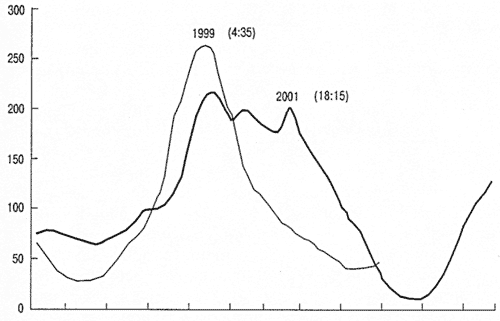 Подъем воды во время наводнений 1999 и 2001 гг. (в скобках указано время максимального уровня; вертикальная ось – высота в см).