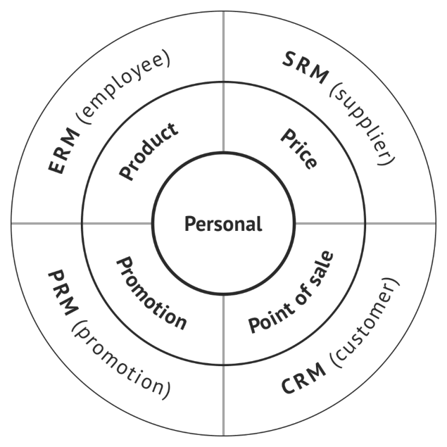 Действительно, а почему не работает CRM – Customer Relationship Management? Потому Customer, клиенты, продажи – это всего одна четверть бизнеса. А бизнес – это отношения (relations) со всеми участниками рынка, не только с покупателями. Давайте еще раз вспомним 4P маркетинга и сопоставим их с участниками рынка: