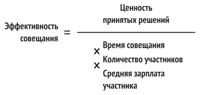 Например, сотрудник приходит с простым вопросом низкой ценности к руководителю с высокой зарплатой. Соответственно, эффективность такого совещания уменьшается. В то время как рядовой сотрудник сам мог решить этот вопрос, сокращая знаменатель формулы.