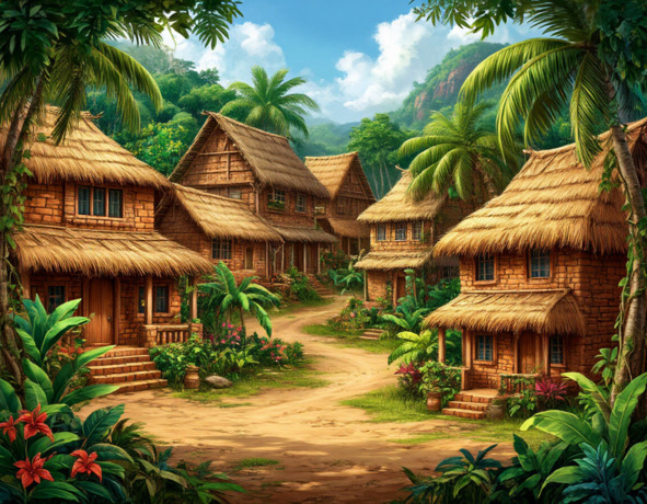 На самом краю джунглей, там, где лес уже отступал перед полями и тропинками, стояла большая деревня. Дома, сложенные из тёмного дерева и глиняных кирпичей, теснились друг к другу, будто стараясь укрыться в тени высоких кокосовых пальм. По утрам над деревней поднимался дымок – женщины разводили огонь, готовя завтрак, а мужчины собирались у центральной площади, обсуждая дела.