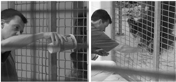 Рис. 1.3. Первое измерение суточного расхода энергии у обезьяны. Сквозь тяжелую ограду Роб Шумейкер выливает в рот Ази воду с двойной маркировкой, смешанную с холодным чаем без сахара (нечеткий профиль Ази едва виден справа). Позже он собирает образец мочи, когда орангутанг цепляется за ограждение лапами.