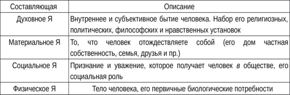 Одна из первых теорий, описывающих «Я-концепцию», была теория Уильяма Джеймса. Он считал, что человека как личность определяют четыре «Я»: духовное, материальное, социальное и физическое.