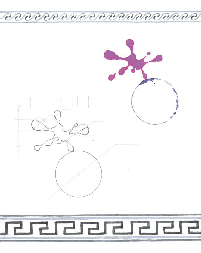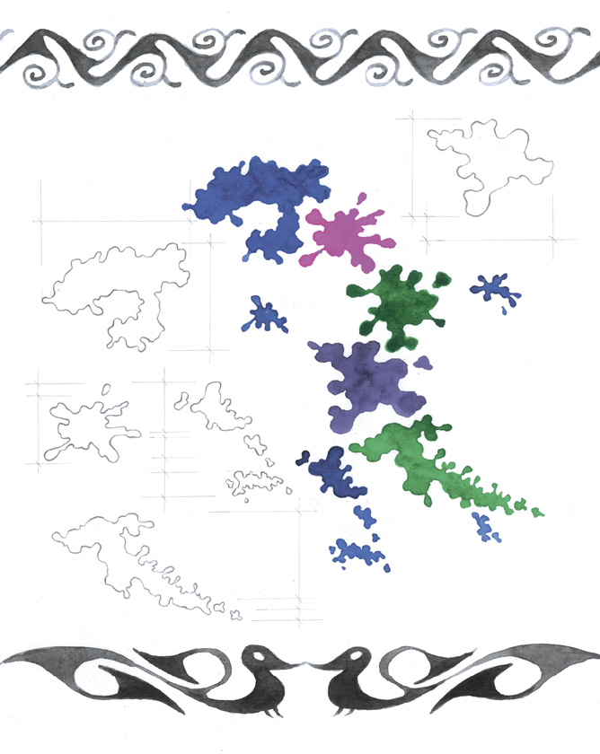 Издательство попросило пояснить в этом коротком вступлении, как устроены иллюстрации. Они состоят из трех основных элементов: клякса, чертеж (или карандашный рисунок) и орнамент. Клякса, след падения капли акварели на белом листе, – естественное физическое явление. Чертеж этой кляксы – попытка человека измерить и понять это физическое явление. Орнамент – один из первых доступных человеку способов описать через рисунок и ритм окружающий мир.