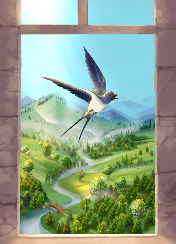Мир был полон чудесамиМного лет тому назад:Говорящими зверями,Волшебством и колдунами,И принцессами, чей взглядБыл ценней, чем всякий клад.И в одном дворце прекрасном,Что парил чуть над землей,Весь светясь огнем алмазнымПоутру на солнце ясномВ мир направлен был слепойВзор принцессы молодой.Но она не тосковала,Сидя молча у окна.Глядя вдаль, она мечтала,Позабыв про все печали,Словно теплая веснаВ сердце ей пришла из сна.Но не принц ей так приснился,Не прекраснейший наряд.Где-то там, в лесу, сокрылсяИ бесшумный затаилсяЗа дверьми незримых вратМир другой – чудесный сад.Не простой сад, а волшебный,Где сбываются мечты.Где ручей течет целебный,Где как будто заповедныйМир чистейшей красотыСохранил свет доброты.И сказал ей сад чудесный,Не пытаясь выгнать прочь:«Здравствуй, милая принцесса.По забытой тропке, лесом,Приходи сегодня в ночь —Я смогу тебе помочь».И тотчас она проснулась,А вокруг уже светло!Встав, принцесса потянулась,Солнцу, миру улыбнулась —В сердце юном так тепло…Как же сладко ей спалось!У окна принцесса села,Будто в солнечном раю.Вдруг ее крылом заделаИ так ласково запела,Сев пред нею на краю,Песню добрую своюТихо ласточка. Красиво,Словно строй душевный нотГде-то весело, игриво,Где-то с грустью чуть, но дивно;Утром в солнечный восходТихо ласточка поет.«Ах, как голос твой божествен!Ты прекрасней всех певиц» —Не наигран и не лестен,Был восторг принцессы честен.Пред царицею всех птиц,Что присела на карниз;Только лишь одно спросила:«Кто ты, можешь мне сказать?»А услышав, поклониласьДа в покои пригласила.Вспомнив после (вот напасть!),Что там надо бы прибрать.И принцесса покраснела,Но царица ей в ответ:«Ты всего лишь не успела.Я ж не в гости прилетела.Я хотела бы, мой свет,Знать, что скажешь – да иль нет».«Да, царица, я готова». —«Хорошо. Ответь тогда:Под ночным пойдешь покровом,В неизвестный сад, по зову,Да еще совсем одна —Ты в решении тверда?»Тут принцесса улыбнулась:«Да, царица мира птиц.Я мечтаю, чтоб вернулся,Глаз моих собой коснулсяСолнца свет“. – „Тогда иди.Следуй светлому пути.А сейчас пора проститься.До свидания!“ – „Постой!Подожди, прошу, царица.Прежде чем успеешь скрыться, —Почему ты здесь, со мной?» —«Ты поймешь. Ответ простой».⠀