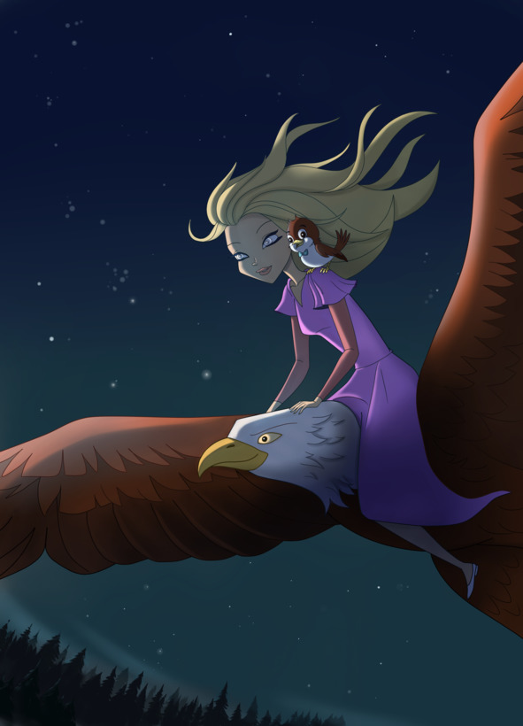 День прошел, и солнце село.Черноглазка спать легла.Но сегодня не разделась,Только лишь о том жалела,Что она должна былаПравду скрыть от короля.К ней зашел он скоро очень;Дочку в лоб поцеловал:«Спи, родная, мой цветочек,Спи спокойно, доброй ночи», —Ей с любовью пожелал.Дверь закрылась. Час настал.Тишину же вдруг нарушилТихий-тихий стук в окно.«Кто ж там может быть снаружи?Что ему в такой час нужно?»Но к окошку все равноПодошла принцесса, но……лишь едва спросить хотела,Кто там в ночь стучится к ней,Как негромко долетело:«Доброй ночи, – чуть несмело, —Я Красавчик Воробей.От царицы птиц, с Полей».Черноглазка удивилась —Странно так, в столь поздний час…В то же время привзбодриласьИ окошко отворила.«Доброй ночи…» – «Очень ВасПопрошу молчать сейчас.Что Вам нужно, мне известно.Вы в решении тверды.Это так? – Кивок. – Прелестно.Потому я здесь, принцесса.Чтобы не было беды,Пригодится поводырь.И еще: прошу Вас оченьМне довериться сполна.Хорошо? – Кивок. – Ну что же,Чтобы путь наш был короче,Безопасней – лишь однаЕсть дорога – из окна».И, принцессу направляя,Встать помог ей на карниз.Ручку крылышком сжимая(Дрожь ее все ж ощущая),С ней упал спиною вниз —Это видел мистер Крыс.Как на мягкую перину,Черноглазка прилегла.«Представляю Мягкодивну,Мы упали ей на спину.Дом ее, как мой, – Поля.С Вами нас она ждала».Очень плавно и бесшумноНа орлице, в темноте,Тихой, теплой и безлунной,Но коварной, хоть безлюдной,Полетели прочь от стенК черноглазкиной мечте.⠀