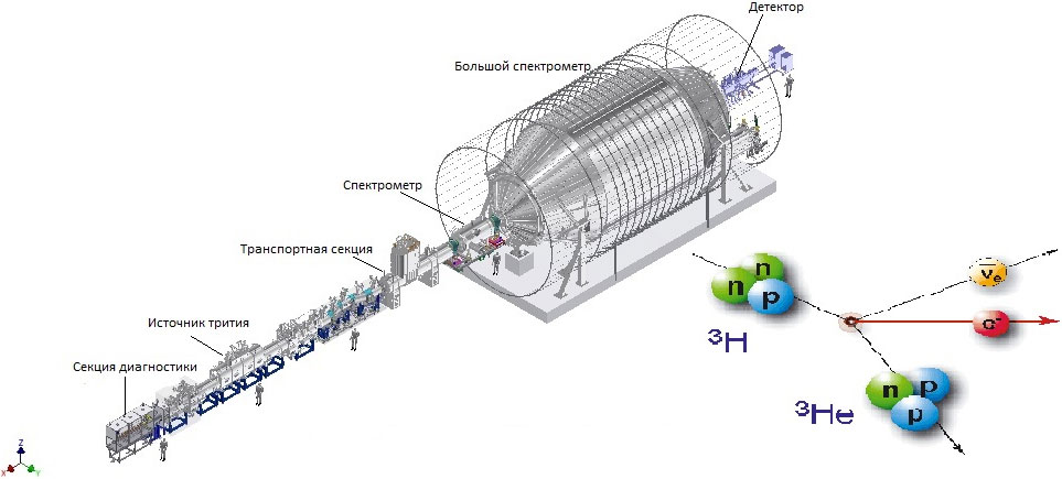 Общий вид эксперимента КАТРИН и схема ядерного распада трития