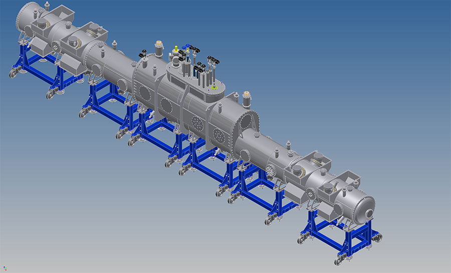 Да, забыл отметить одну важную особенность этого проекта. Поскольку заказчик придает огромное значение системе стабилизации температуры пучковой трубы, они в техническом задании отдельным этапом работы включили так называемый «Демонстратор». По их мнению необходимо показать практически в процессе создания всей установки работоспособность системы стабилизации температуры пучковой трубы. Как это сделать? Было много разговоров, но никто толком не понимал с чего начать. В итоге мне неожиданно пришла, как потом оказалось, спасительная мысль, а что если максимально использовать все элементы установки и в упрощённом варианте собрать как бы часть её без магнитов, без жидкого гелия а с криокулерами – специальными охлаждающими устройствами? И неожиданно всем эта идея понравилась, так как была очевидна большая экономия и стало ясно, что нужно делать. Практически было найдено великолепное решение и можно было параллельно делать как бы две установки, одну для испытаний пучковой трубы и другую, основную, причём после испытаний пучковая труба будет полностью использована в основной установке.