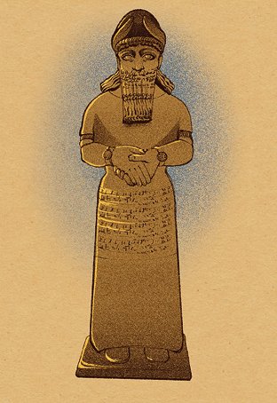 В Месопотамии божество нередко принимало форму антропоморфной статуи. На божественность указывали ее большой размер и некоторые особые атрибуты: рогатая тиара, крылья на спине, индивидуальные символы божеств или сопровождающие их символические животные. Положение статуи свидетельствовало о ее верховной власти: она стояла на возвышении или сидела на троне. По крайней мере, так божественные статуи представлены на ассирийских барель-ефах, в росписях дворца в Мари и на цилиндрических печатях – единственных оставшихся следах изображений божеств: ни одна из статуй главных богов шумеро-аккадского пантеона не сохранилась.