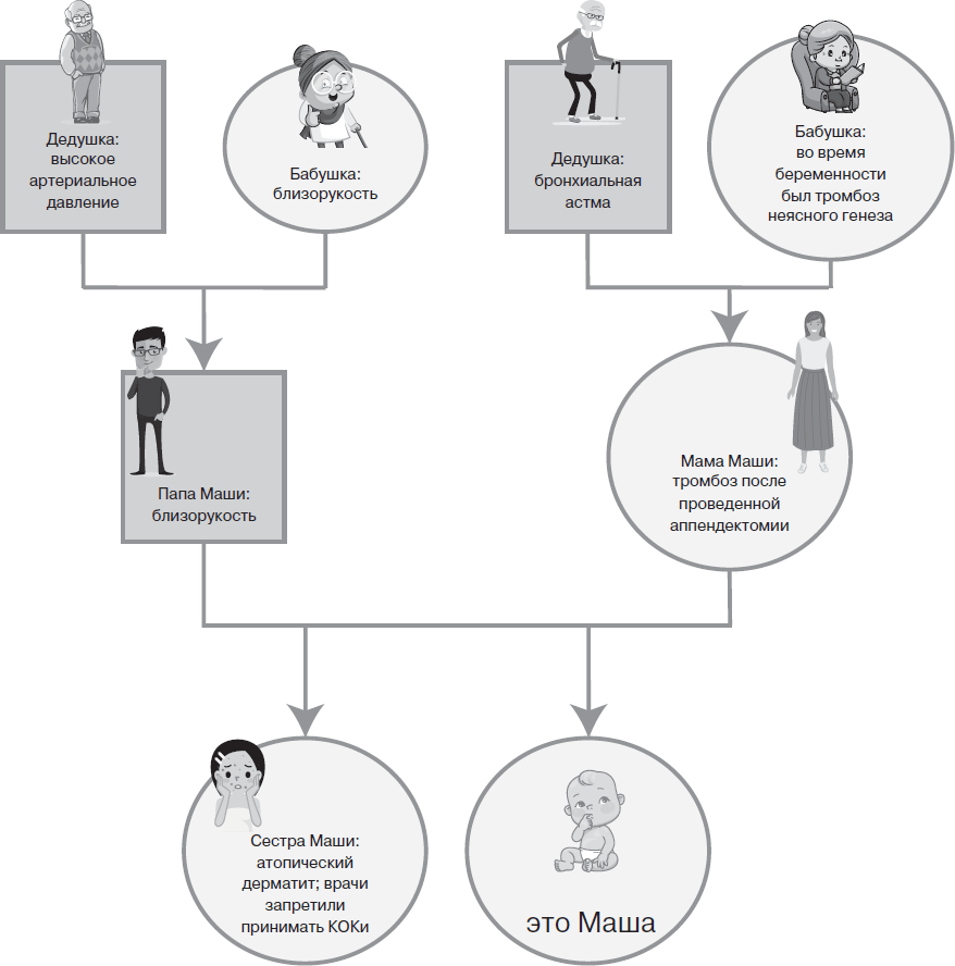 Благодаря построенному нами графику гинеколог Маши наглядно видит наследственный анамнез и может просчитать все риски. Будет здорово, если такая схема будет составлена еще и для родственников со стороны партнера.