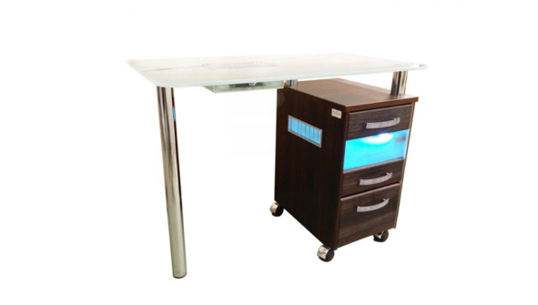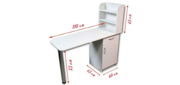 Стандартный маникюрный стол имеет длину 110см, высоту-73-75см и глубину от 40 до 45 см. Большинству мастеров этого достаточно для расположения инструментов, материалов, вытяжки. Некоторые производители предлагают мебель с регулировкой высоты.