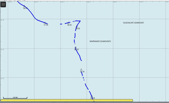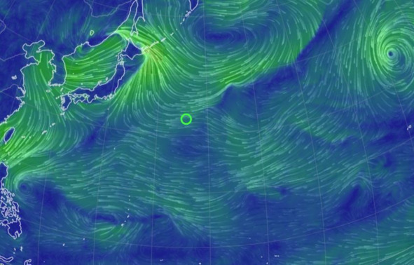 Мы только что выскочили из антициклона, тоже семибалльного. Как-то Япония жестко постелила, несмотря на раннее время года. Волна сразу присела, луну включили. Выглядит, почти как в тропиках, и температура +29 в каюте. На юге депрессия пересекает наш курс, так что мы туда пока не пойдем, пойдем на восток, может и турбину сделаем по умеренным ветрам. Дальше, в пассате не сделать, только в экваториальной зоне.