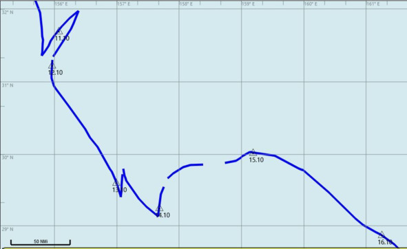 Сейчас четыре часа утра по Владивостоку, 17 октября, правый галс, бейдевинд, генеральный курс 140 градусов. Мы уже на 27—58с.ш. и 162—12в. д. Лодка несет нормальный для умеренных ветров наряд, с кливером, стакселем, фоком, и гротом. Только грот всё ещё зарифлен на две полки – я впервые за последние две недели приоткрыл носовой люк. Побаиваюсь, что с полным гротом это пока несовместимо.