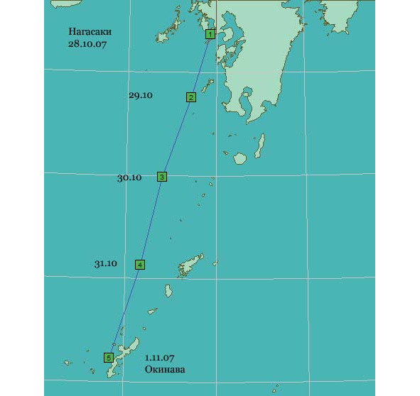 Отправили факсом все бюрократические бумаги для выхода на Окинаву, получили «добро». На Окинаву уходим завтра, в воскресенье. С утра отправим матроса Егорову в Осаку синкансеном (поезд такой, скоростной), в середине дня уйдем.