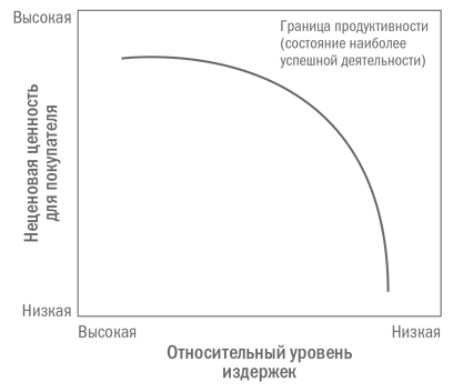 Различия в операционной эффективности стали фундаментом японского наступления на западные компании в 1980‑х годах. Японцы настолько опережали конкурентов по операционной эффективности, что могли одновременно предложить и более низкую стоимость, и более высокое качество. На этом стоит остановиться подробнее, потому что на этом основана немалая часть современных дискуссий о конкуренции. Представьте себе границу продуктивности, которая охватывает все наиболее успешные практики, существующие в конкретный момент времени. Это можно представить как максимальную ценность, которую компания, поставляющая товар или услугу, может создать при данных затратах, используя наилучшие из существующих технологий, умений сотрудников, методов управления и покупаемых средств производства. Понятие границы продуктивности может применяться к отдельным видам деятельности; к группам связанных между собой видов деятельности, например таких, как обработка заказов и производство, и ко всей деятельности компании в целом. Повышая свою операционную эффективность, компания приближается к границе продуктивности. Это может потребовать капиталовложений, набора новых сотрудников или просто новых методов управления.