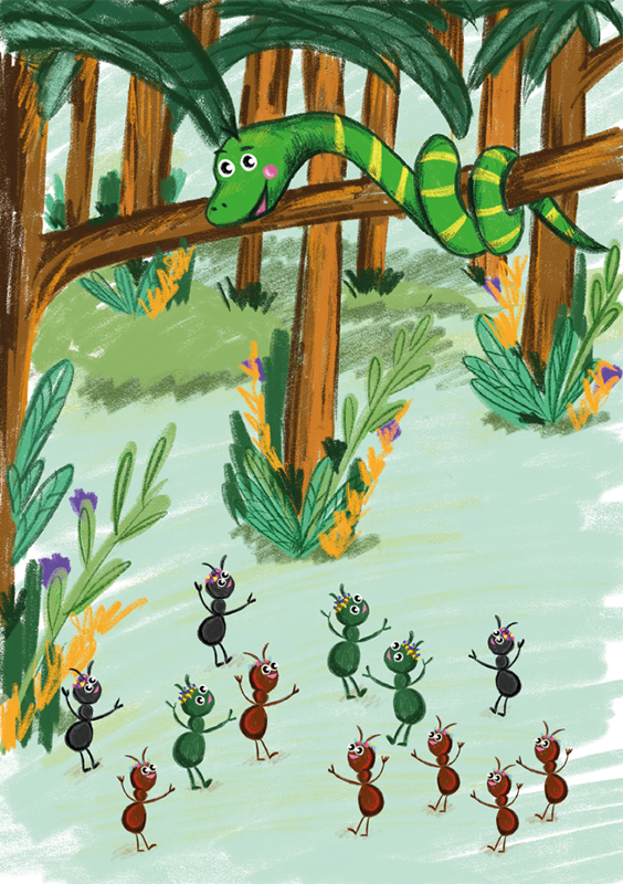 Una vez hubo ayudado a su amigo Pico, la serpiente lectora quiso seguir su camino, pero desde lo alto de su árbol vio una fila larguísima de hormigas. Por un momento pensó que había una fiesta en algún lugar de aquella inmensa selva que tan bien se conocía, quizás en la Roca de las Proyecciones2, donde a última hora de la tarde se reflejaban los rayos del sol de tal manera que creaban sombras de miles de formas y reflejos de colores de las preciosas flores que allí había. Así que le preguntó a una de las hormigas por qué iban tantas juntas y de tantos colores.