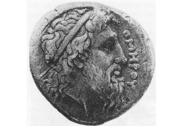 Монета 1У века до н.э., отчеканенная на острове Хиос, где по преданию был похоронен Гомер. На монете – имя Гомера и его изображение с широко открытыми зоркими глазами.