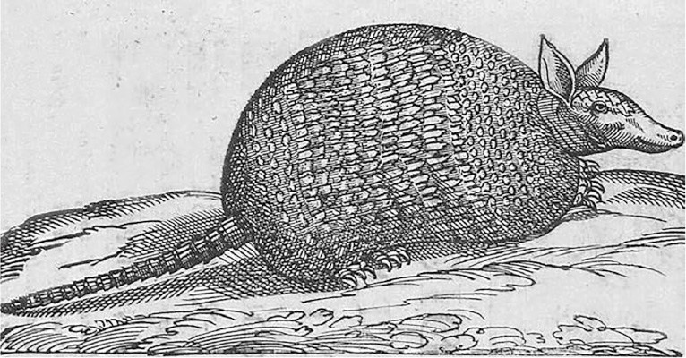 Рис. 2. Гравюра броненосца, скопированная с рисунка, сделанного индейским художником в Мексике в XVI в.; из опубликованной рукописи Франсиско Эрнандеса «Сокровищница лекарственных материалов из Новой Испании» (1628)