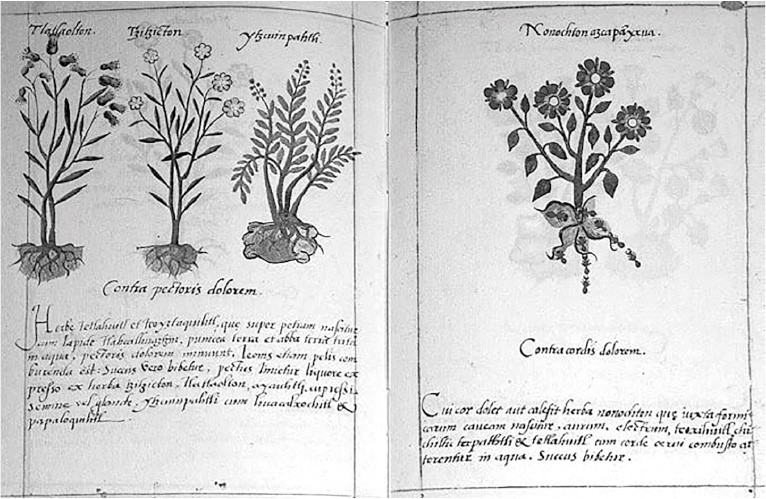 Рис. 3. Иллюстрация из «Книжицы целебных трав индейцев» (1552) Мартина де ла Круса. Среди корней растения ицкин-патли (третье слева) нарисован ацтекский глиф «камень»