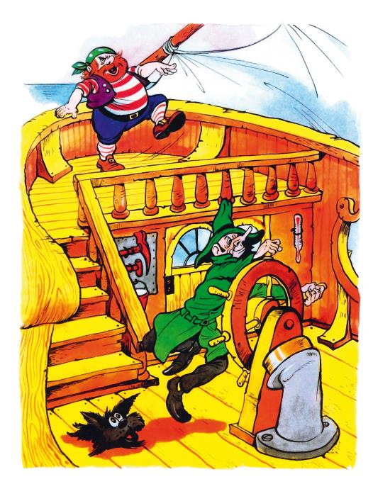 Весь белый от муки, по уши перепачканный в тесте, Дырка попытался испечь хоть что-нибудь. Но первый блин, который он подкинул, чтобы перевернуть в полёте, прилип к потолку. А второй вылетел в открытый люк и просвистел мимо уха рыжебородого капитана.