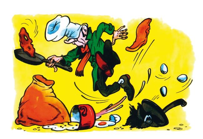 Первым делом шпион полез за посудой. Кастрюли аккуратно стояли одна на другой до самого потолка. Вместо того, чтобы взять верхнюю, Дырка выхватил самую нижнюю. Послышался страшный грохот: «Бам-дзынь-блямс», – и все кастрюли посыпались ему на голову.