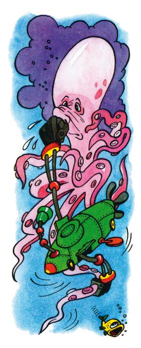 Но Самоделкин предвидел любую опасность и был готов к самым разным неожиданностям. Он нажал на рычаг, и тут же из специальных отверстий лодки выскочили две железные руки, которые начали борьбу с морским чудищем.
