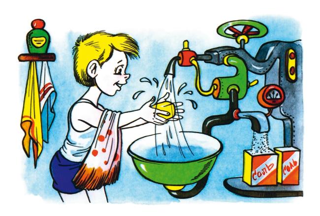 Но всё не так ужасно, когда на свете существуют такие замечательные мастера, как Самоделкин. Он не просто сделал кран для умывания. Внутри крана он смастерил специальный приборчик, который выделял соль из воды. И теперь из крана ребятишкам в ладошки лилась обыкновенная пресная вода.