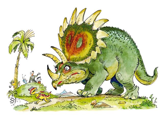 – Не двигайтесь! – прошептал профессор Пыхтелкин. – Это стиракозавр, очень сильный и опасный динозавр. Видите, какое огромное украшение у него на носу?