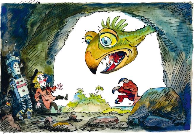 И тут огромная птица просунула свой гигантский клюв в пещеру в надежде кого-нибудь схватить. Она защищала яйца с птенцами, и потому была очень сердита.