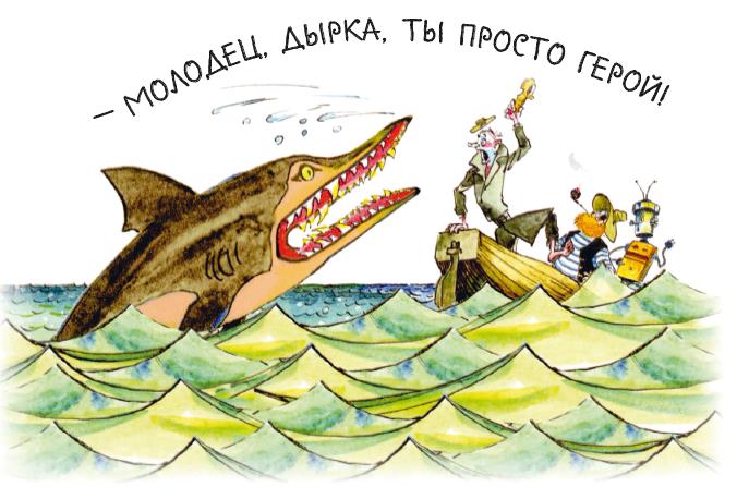 – Скорее! Скорее! – торопил Дырка. – Быстрее гребите вёслами, а то мне очень страшно.