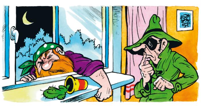 – Повезло! – улыбнулся шпион Дырка. – Его нет дома, встаньте поближе к дому, а я заберусь к вам на плечи.
