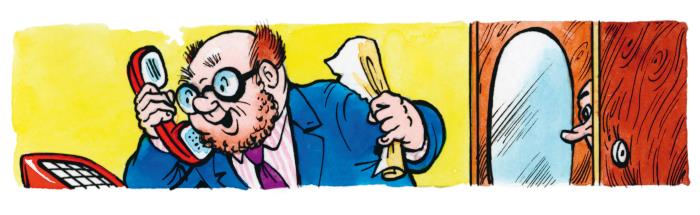 Разбойники едва-едва успели спрятаться, как в кабинет, словно вихрь, влетел профессор Пыхтелкин. Географ радостно насвистывал весёлую мелодию: у него было отличное настроение. В руках учёный держал какой-то старинный свиток. Учёный подошёл к письменному столу, бережно положил свиток и, сняв телефонную трубку, набрал номер.