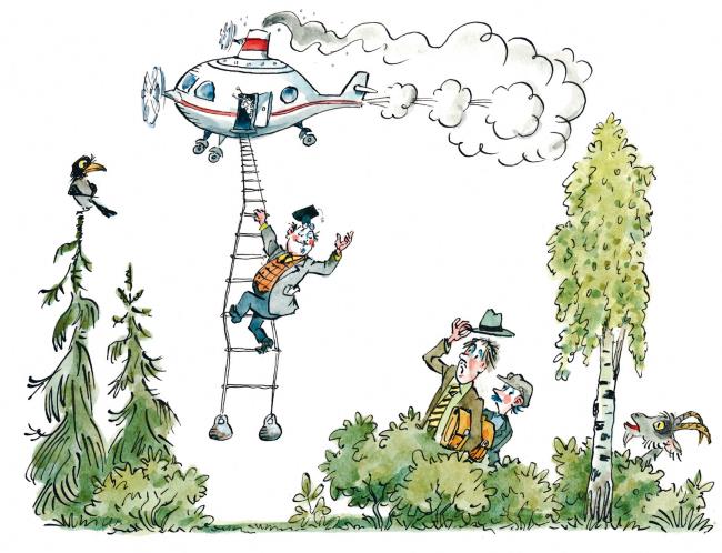 Директор Сосискин опасливо выглянул из кустов и разглядел над собой буквально в нескольких метрах полувертолёт-полудирижабль. Из выхлопной трубы вырывались клубы пара, при этом чудо-машина смешно фыркала и урчала. По бокам с огромной скоростью вращались два небольших пропеллера. В машине сидели три пассажира в очках и специальных лётных шлемах.