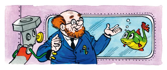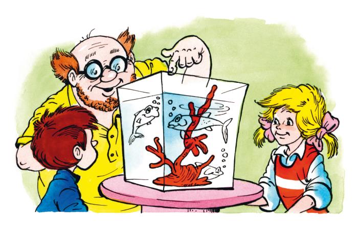 Карандаш нарисовал большой аквариум с морской водой, который тут же превратился из нарисованного в настоящий, а профессор Пыхтелкин запустил туда своих прозрачных ледяных рыбок.
