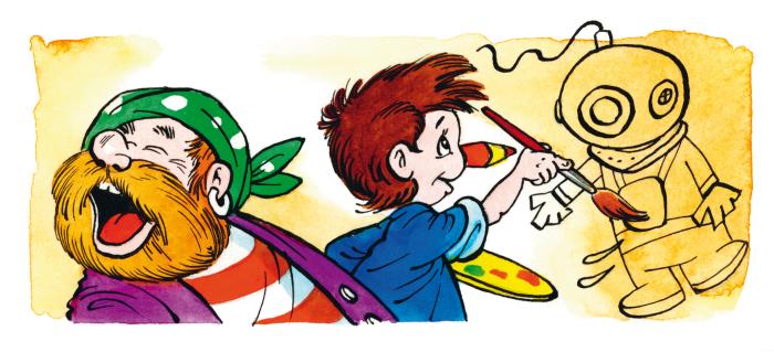 Прутик принёс учителю волшебные краски и карандаши. Волшебный художник подошёл к чистой стенке и стал быстро рисовать. Самоделкин встал рядом с художником и объяснял Карандашу, какие проводки куда тянутся. По совету Самоделкина художник нарисовал в каждом акваланге специальное переговорное устройство, для того чтобы водолазы могли разговаривать друг с другом. Разбойники отказались от прогулки по дну океана.