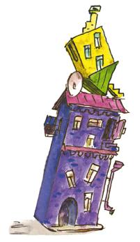 Торопливо шагая за важным марсианином, путешественники с интересом разглядывали город. Все дома в нём были разноцветные: жёлтые, зелёные, оранжевые, фиолетовые, коричневые – но немного кривые: загнуты то в одну сторону, то в другую.
