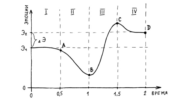Можно подготовить график. Линия абсцисс – это длительность фильма, скажем, 120 минут или 2 часа. Линия ординат – это эмоциональное состояние зрителя. Тогда 0 – это абсолютно отрицательные эмоции, смерть, а 1 – это абсолютная радость. Предположим, что зритель пришёл в зал, запасся попкорном. Его эмоциональное состояние – 0,5, то есть нейтральное.