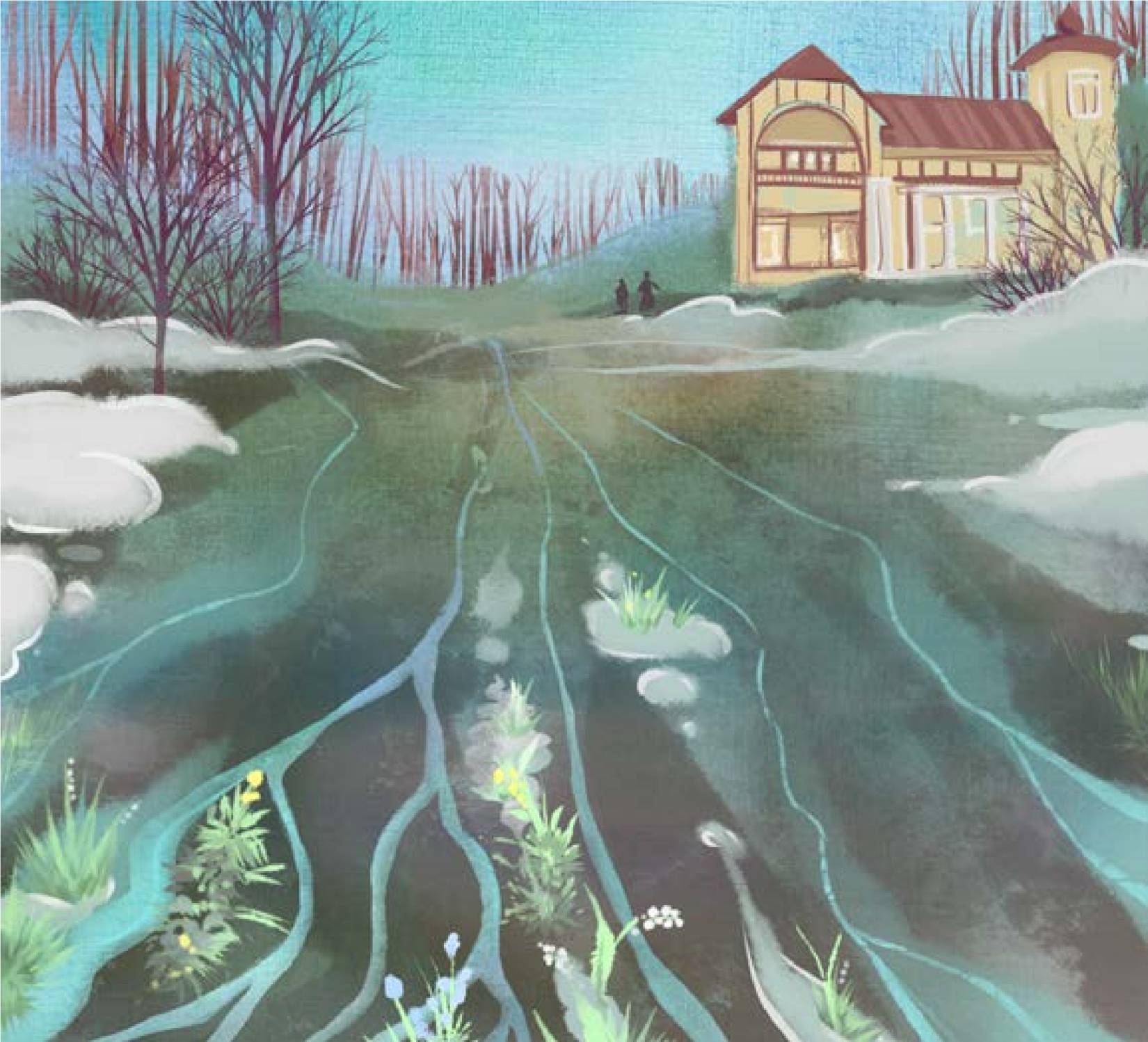 Снег тает и покрывает поляны сетью стремительных водяных потоков.