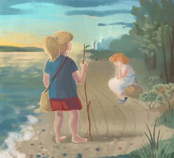 Марина гуляла вечером на берегу реки, собирая камушки для будущих поделок. Серый и плоский будет холстом для пейзажа, маленький и круглый станет частью маленького человечка. За этим занятием она не сразу заметила девочку на бревне на песке.