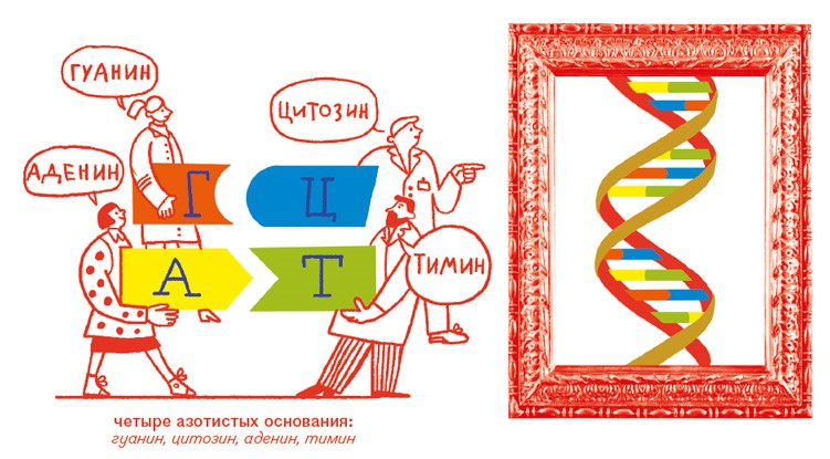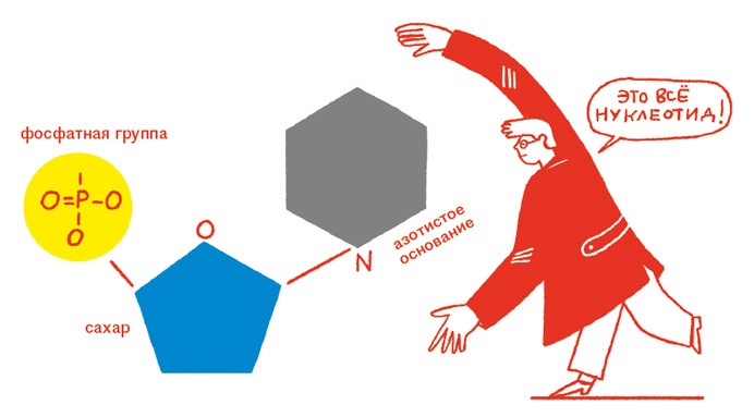 Откуда буквы внутри ДНК?Вся информация об организме зашифрована в ДНК в виде четырехбуквенного кода. Конечно, это не настоящие печатные буквы, а химические соединения. Если точнее – азотистые основания. В ДНК их четыре: аденин (А), тимин (Т), гуанин (Г) и цитозин (Ц). К азотистому основанию друг за другом цепляются моносахарид (это такой углевод, самый простой из сахарóв) и остаток фосфорной кислоты. И тогда получается нуклеотид. Из нуклеотидов и построена ДНК. Они соединяются в цепочки: образуют последовательность. Это своего рода алфавит генома.