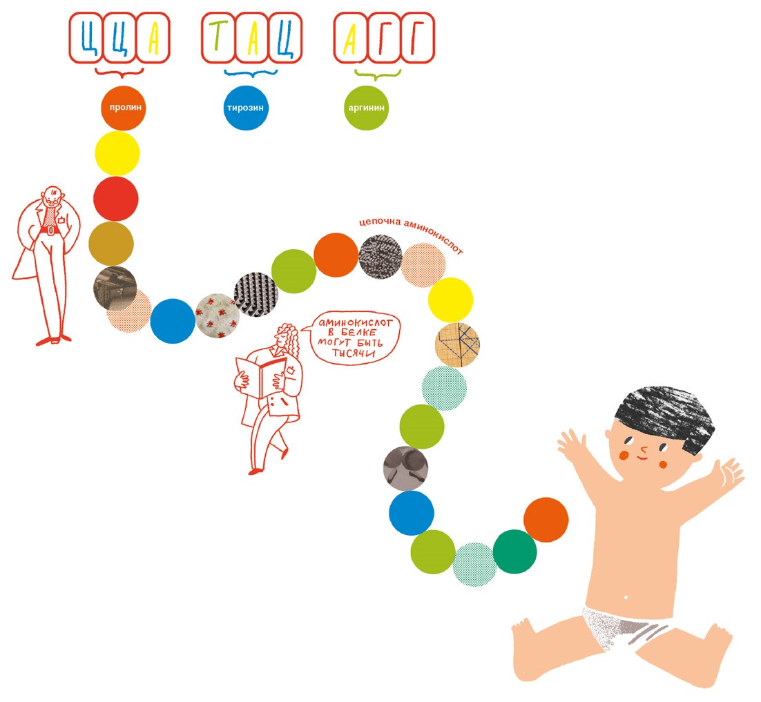 «Язык» ДНК работает так: каждые три буквы генетического кода (то есть каждые три нуклеотида) обозначают аминокислоту. Назовем их словами.