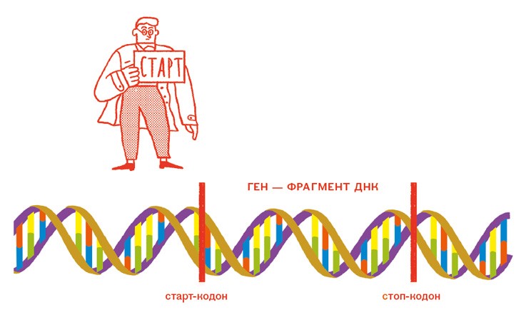 Каждый ген – абзац в нашей книге, и в нем записан один или несколько белков. У такого абзаца есть начало – старт-кодон, а есть конец – стоп-кодон.