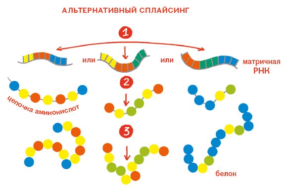Раньше считалось, что один ген кодирует один белок. На самом деле это не совсем так. Есть такой процесс – альтернативный сплайсинг. Называется сложно, но роль у него простая и понятная: сделать так, чтобы ген кодировал сразу несколько форм одного белка. Причем в клетке эти белки могут выполнять как похожие, так и совсем разные задачи. Один ген может кодировать и разные белки. Делает он это за счет альтернативных рамок считывания.