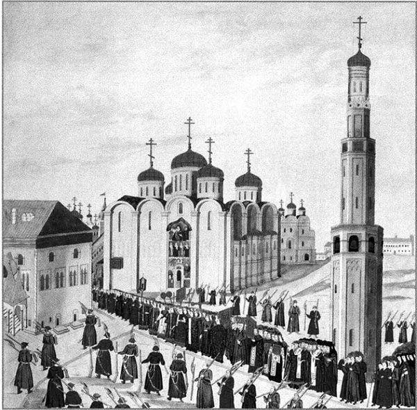 Шествие высшего духовенства, царя Михаила Федоровича, бояр, дворян и горожан по территории Московского Кремля в Успенский собор 3 мая 1613 года. 1672–1673 гг.